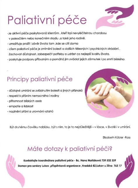 V našem domově nabízíme možnost využití paliativní péče, možnost využití kaplana (neváhejte nás oslovit při Vaší návštěvě, případně si můžete domluvit osobní schůzku – viz.kontakty).